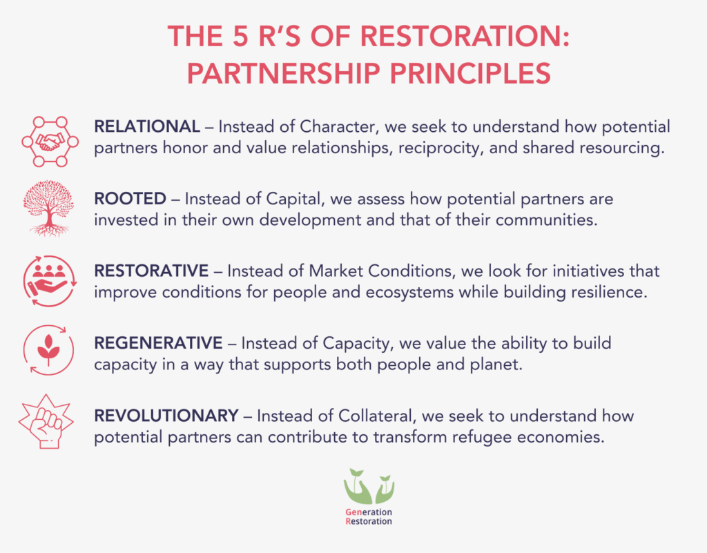 The 5 Rs of Restoration offer a values-based approach to building and nurturing partnerships – rooted in reciprocity, shared growth, and mutual trust. They represent a regenerative alternative to extractive financial models such as the “5 Cs of Credit” and focus on what truly matters: empowering people and restoring ecosystems.